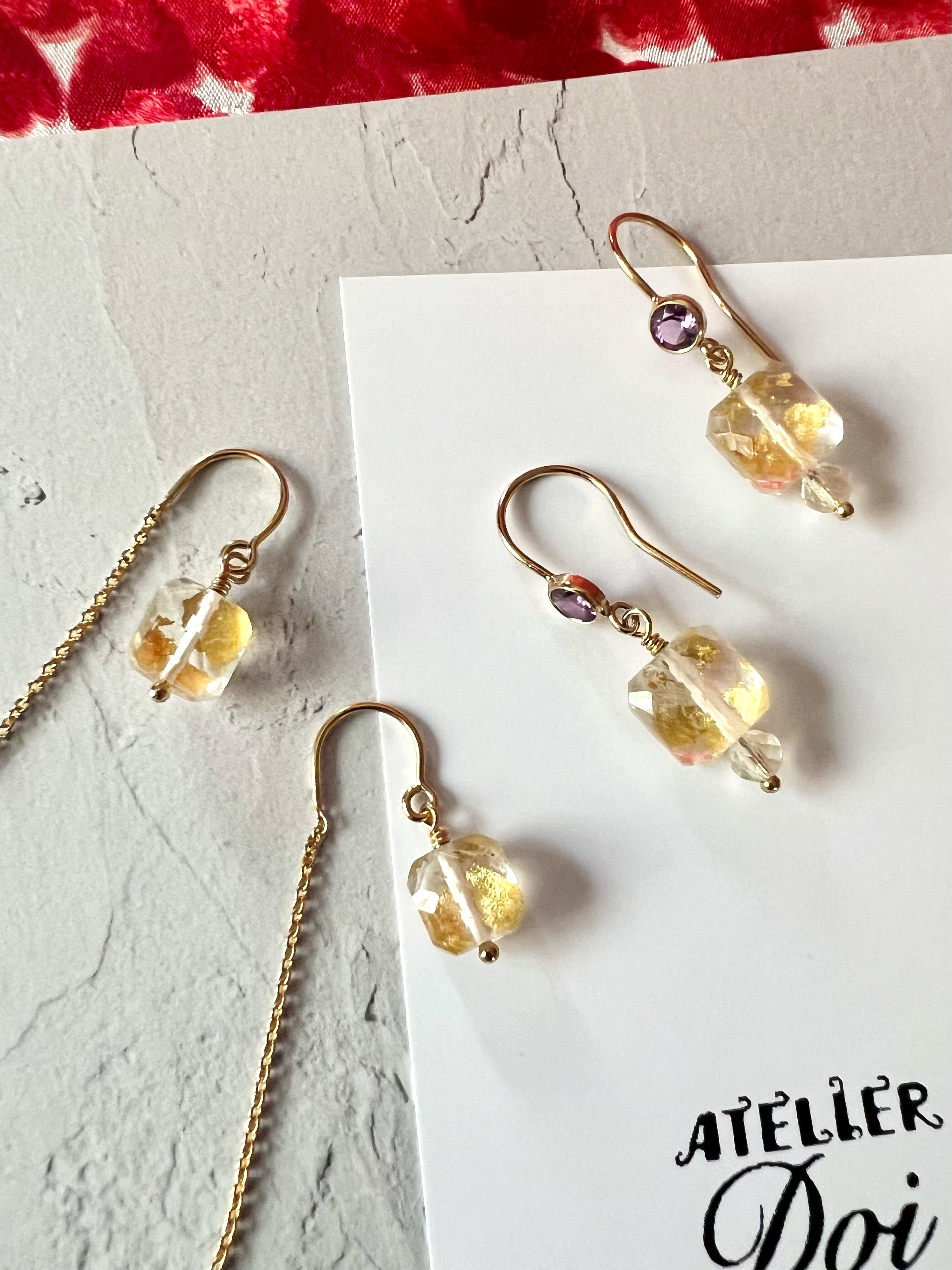 22k金箔クリスタルのアメジストフックピアス 天然石 k14gf